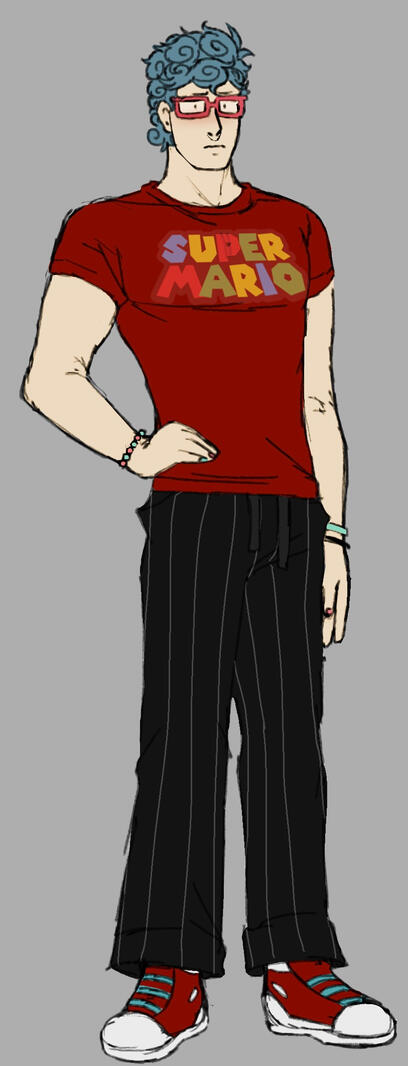 Ghiaccio is 5’7 (170 cm i think), and has a lean/slightly buff build. He’s normally slouched due to bad posture. He has naturally blonde hair, but dyes it blue due to Melone convincing him after he dyed his hair purple. The bridge of his nose has very faint freckles scattered along it, and has braces lined across his teeth, and his glasses are unscratched with no damage. (his glasses are precious to him) When not in his attire for La Squadra, he prefers to wear even more comfortable clothes. He likes comfort over luxury. He’ll wear graphic tees, mostly related to video games or pop culture. His nails are painted pink and blue, they were painted by Sonno due to them not enjoying the texture of nail polish on their own skin.. so Ghiaccio offered for his nails to be the canvas. He has one homemade bracelet always around his wrist, which was also made by Sonno.